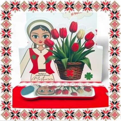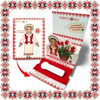Martisor ambalat premium pe suport de carton tip felicitare 3D de culoare bej cu catifea rosie, tematica inspirata din folclor si stil prietenos, design traditional, stil modern.