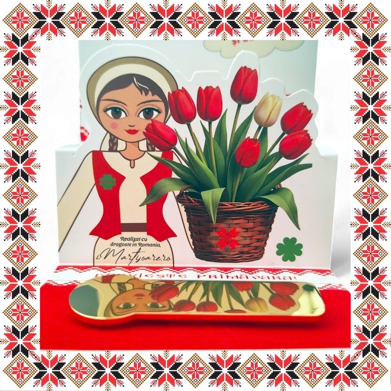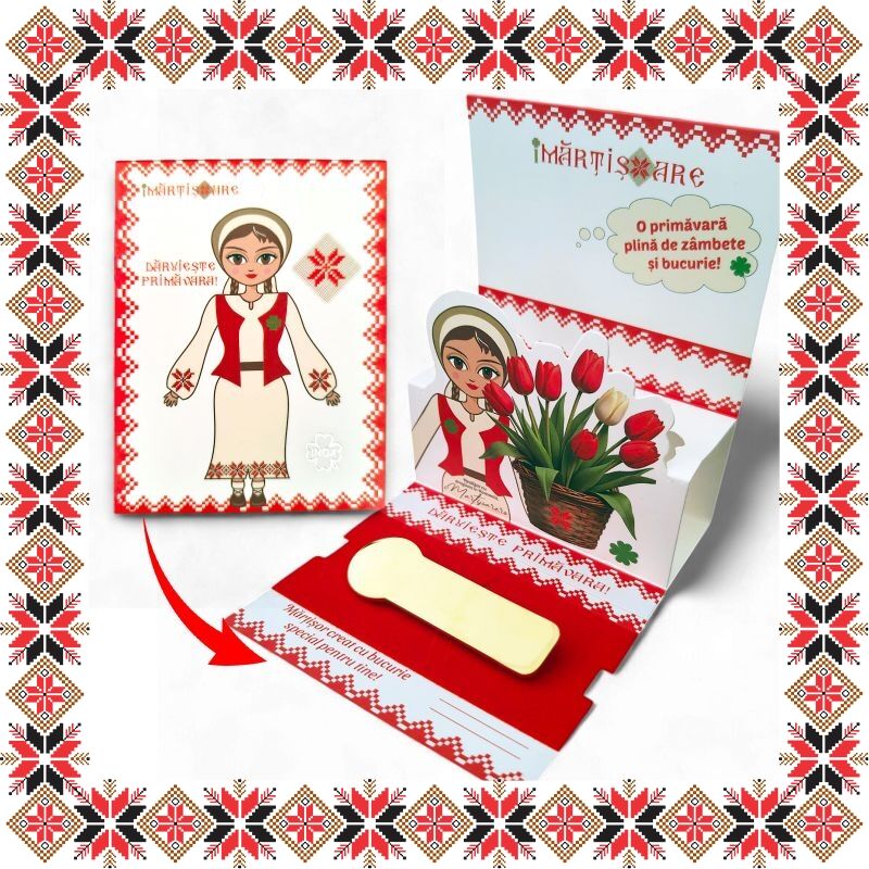 Martisor ambalat premium pe suport de carton tip felicitare 3D de culoare bej cu catifea rosie, tematica inspirata din folclor si stil prietenos, design traditional, stil modern.