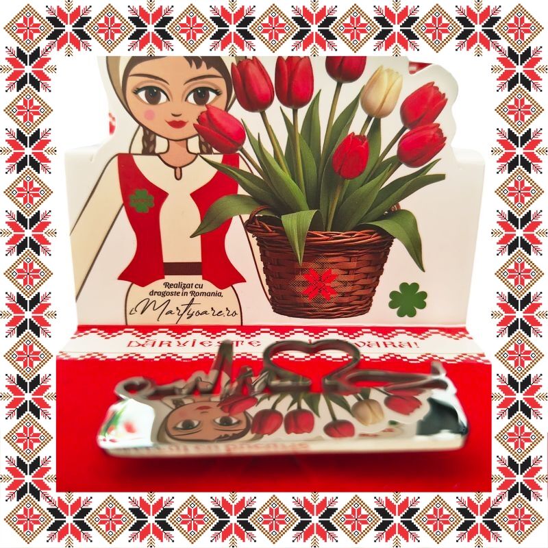 Martisor ambalat premium pe suport de carton tip felicitare 3D de culoare bej cu catifea rosie, tematica inspirata din folclor si stil prietenos, design traditional, stil modern.