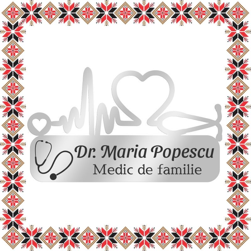 Martisor brosa personalizata tip ecuson medical. Realizat din inox si personalizat pentru cadrele medicale prin gravura laser cu simbol medicina de familie, numele si specializarea doctorului sau asistentei. Forma eleganta de placuta cu stetoscop, inima si ritm cardiac. Opteaza pentru un martisor realizat din otel inoxidabil pentru ca primitoarea sa il poata purta tot anul.