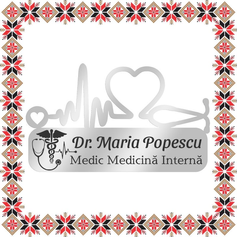 Martisor brosa personalizata tip ecuson medical. Realizat din inox si personalizat pentru cadrele medicale prin gravura laser cu simbol Medicina interna, numele si specializarea doctorului sau asistentei. Forma eleganta de placuta cu stetoscop, inima si ritm cardiac. Daruieste martisoare deosebite, personalizate special pentru oamenii pe care ii iubesti, pe care ii admiri, celor carora vrei sa le multumesti si celor carora vrei sa le daruiesti un gand bun odata cu venirea primaverii! Opteaza pentru un martisor realizat din otel inoxidabil pentru ca primitoarea sa il poata purta tot anul.