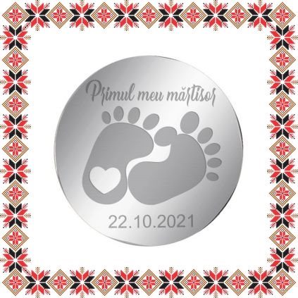 Brosa martisor banut din inox de culoare argintie gravata cu picioruse de bebelus cu inima, mesajul "Primul meu martisor" si data pe care doresti sa o tina minte. Alege un martisor realizat din otel inoxidabil pentru ca nu isi schimba culoarea, este rezistent in timp si poate fi purtat tot anul ca accesoriu de prindere a esarfei, ca brosa pe sacou sau ca decoratiune pe geanta. Ofera primavara in dar cu un martisor creat special pentru tine!