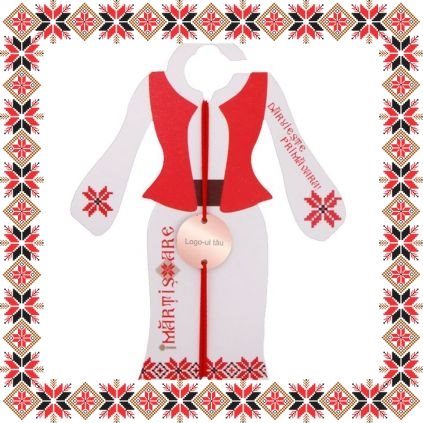 Martisor ambalat pe suport de carton de culoare bej in forma de costum popular romanesc cu motive traditionale. Plic de hartie imprimat cu motive traditionale romanesti CADOU!